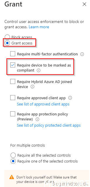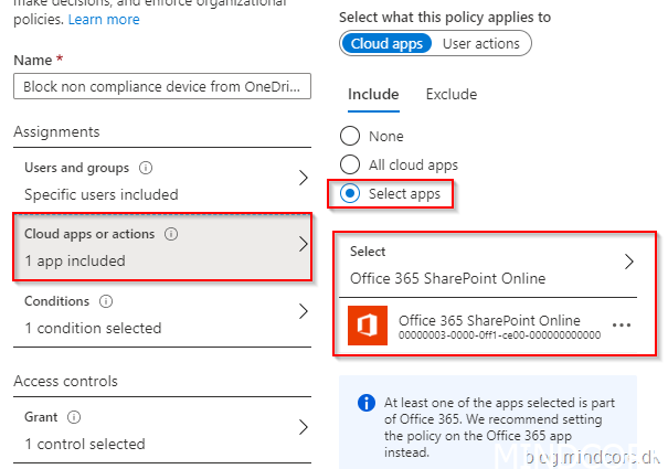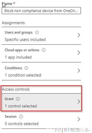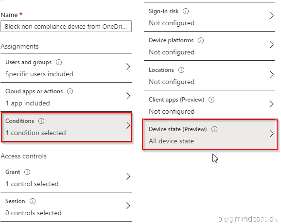 As we do not want to block if users are traveling or at home, we will block defined on “Device state”. To access OneDrive your device will need to be either Hybrid domain joined or Compliant. This also means that we need to have Intune in place.