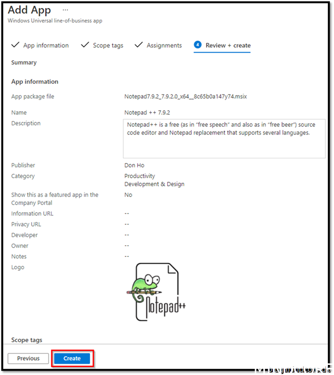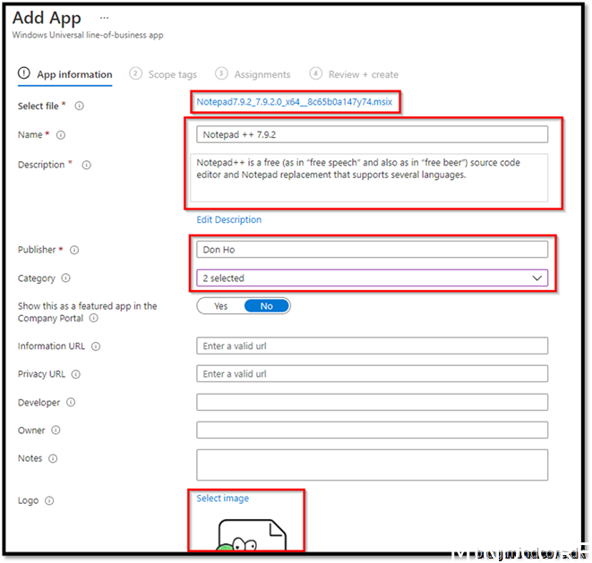 Add information as you go along. It is always a good idea to include logo to let your users be able to find the product faster when going into the company portal. Click Next