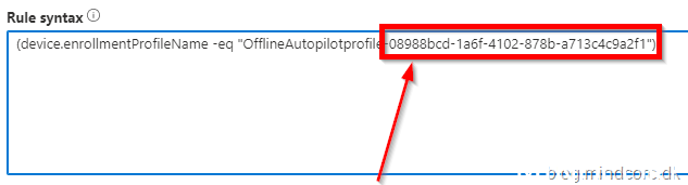 Insert (device.enrollmentProfileName -eq “OfflineAutopilotprofile-08988bcd-1a6f-4102-878b-a713c4c9a2f1”)