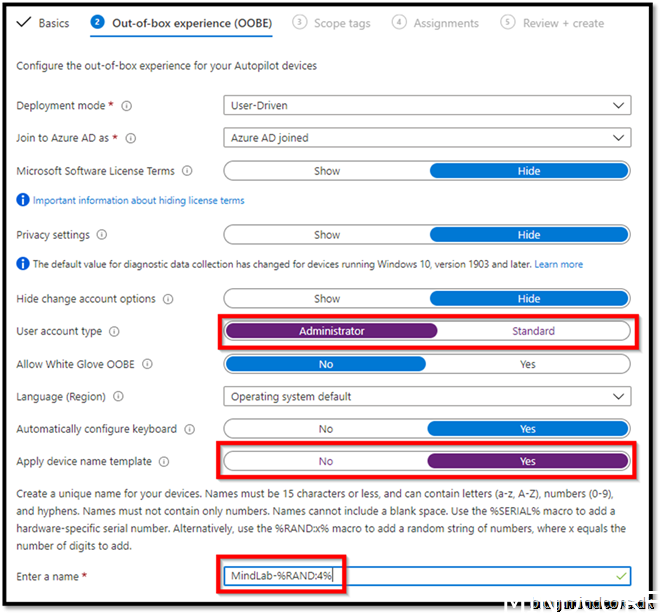 My device should be a user driven Autopilot experience. Set settings as beneath.