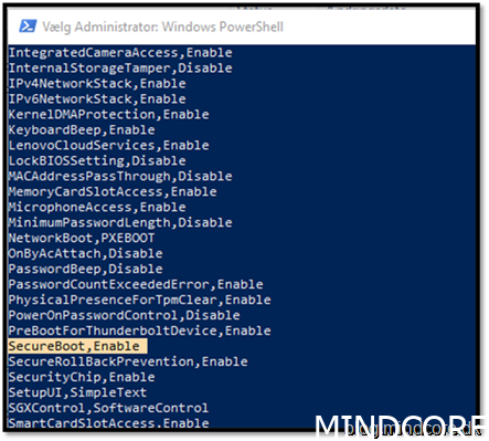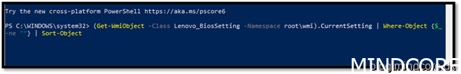 (Get-WmiObject -Class Lenovo_BiosSetting -Namespace rootwmi).CurrentSetting | Where-Object {$_ -ne “”} | Sort-Object
