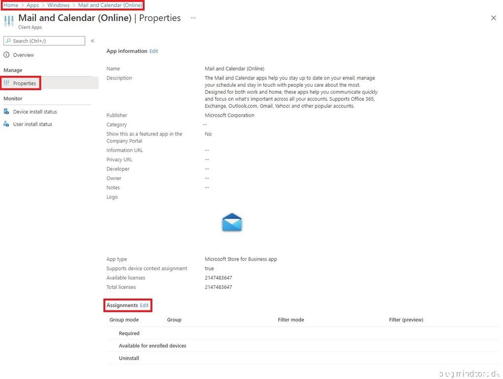 Click on “Mail and Calendar (Online)” and go to “Properties”, click on “Edit” for assignments.