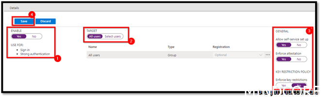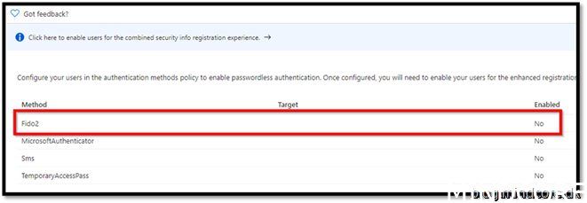 Before users will be able to use FIDO as an authentication method, it must be enabled in the tenant. This can be done for all users or only for a specific group.
