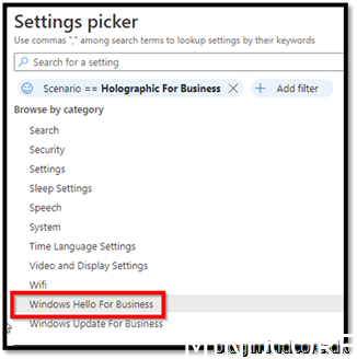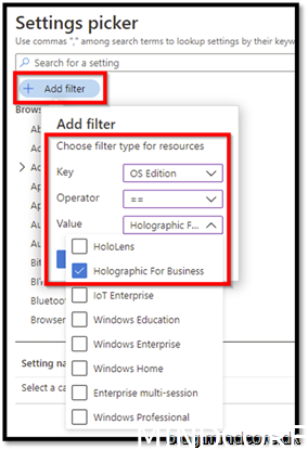 Before searching for your settings make sure you only search on the platform for what you need your policy to support. Add filter choose Holographic for Business