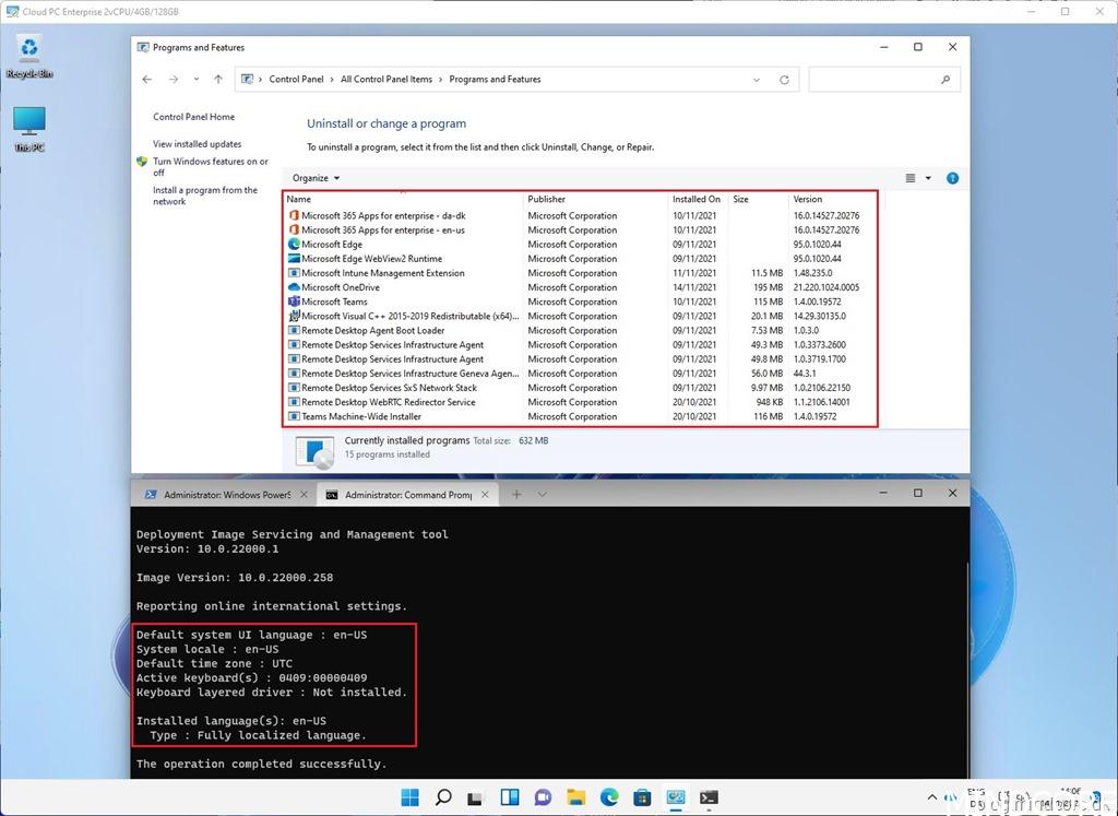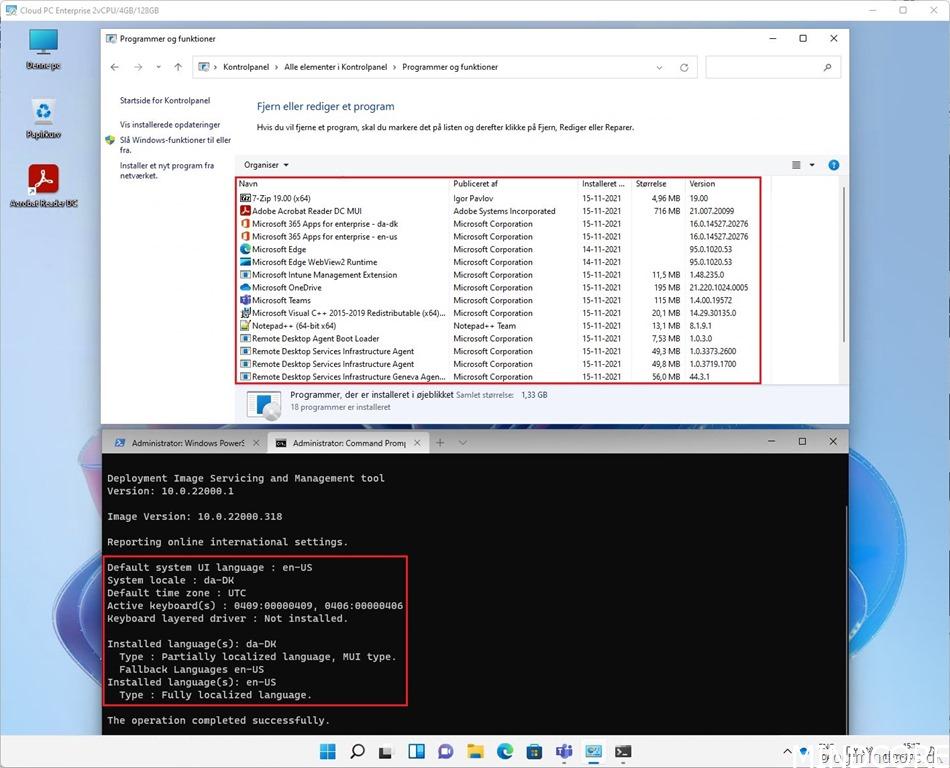Success! My Windows 365 Cloud PC is now in Danish and the added applications are still present for the user logged on…