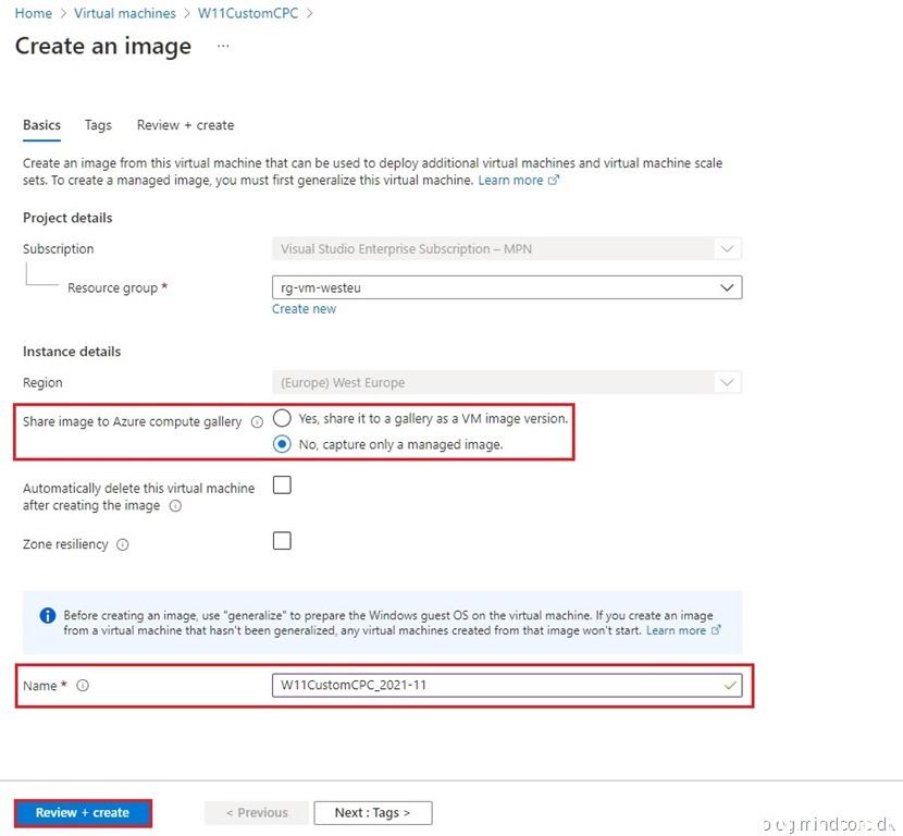 Create or choose an existing resource group, select “No, capture only a managed image.” give the image a name and click Review + create.