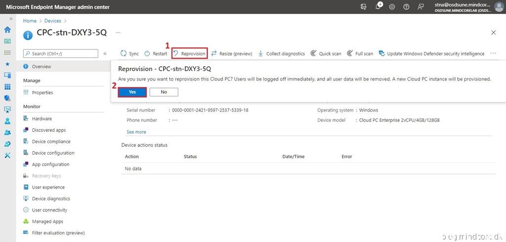 Select your Cloud PC from the list of devices and click on Reprovision.