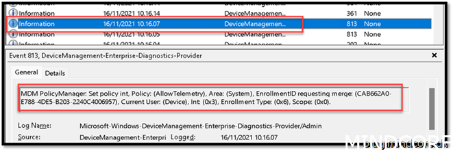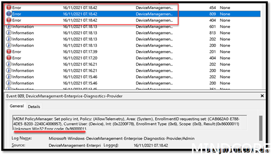 (The event log can be found in Applications and Services Logs -> Microsoft -> Windows -> DeviceManagement-Enterprise-Diagnostics-Provider -> Admin)