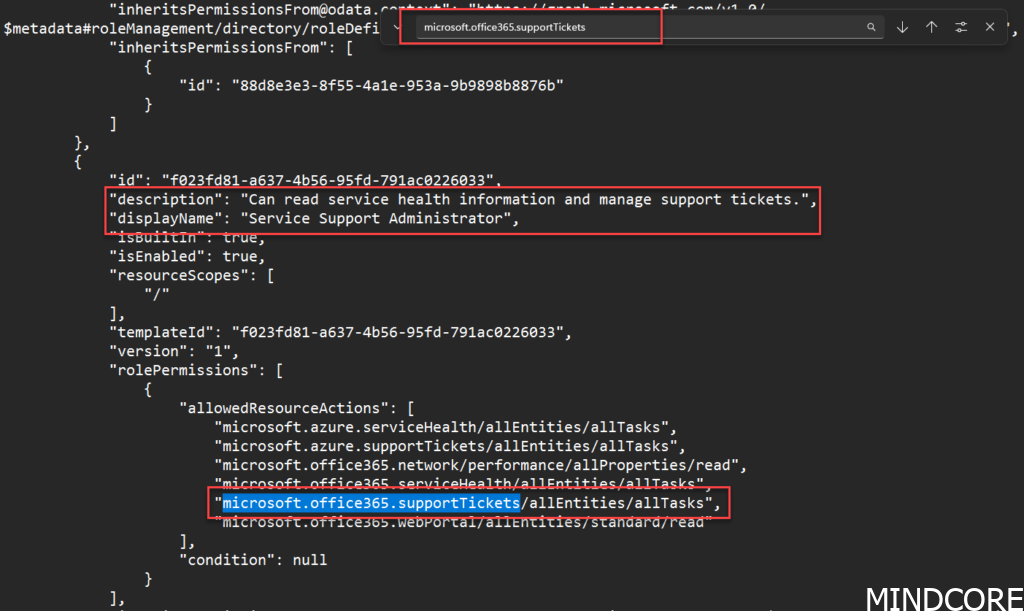 Copy the response preview into a notepad document and start searching for Microsoft.office365.supportTickets