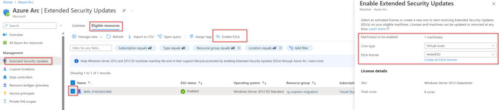 Once the license has been created and activated it can be assigned to the previously listed eligible machines directly from Azure Arc: