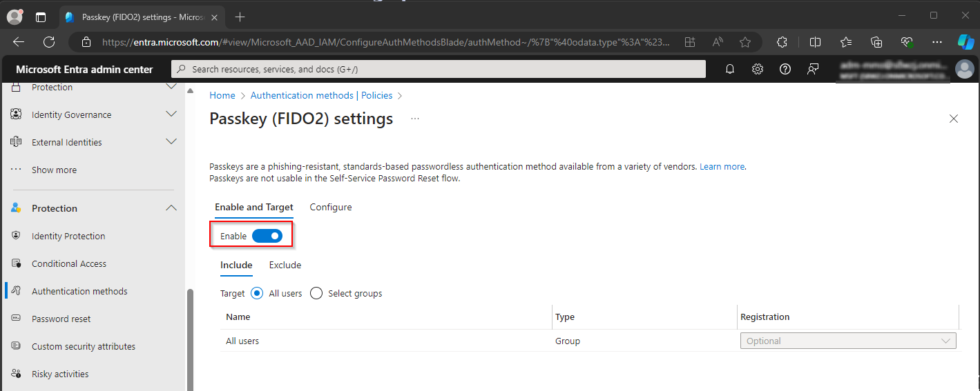 If you are unsure if Passkey is enabled or not for you tenant, visit the Entra ID Portal under Entra Portal > Protection > Authentication Methods > Policies > Here set the enablement to Yes. Here select a test group or all uses.