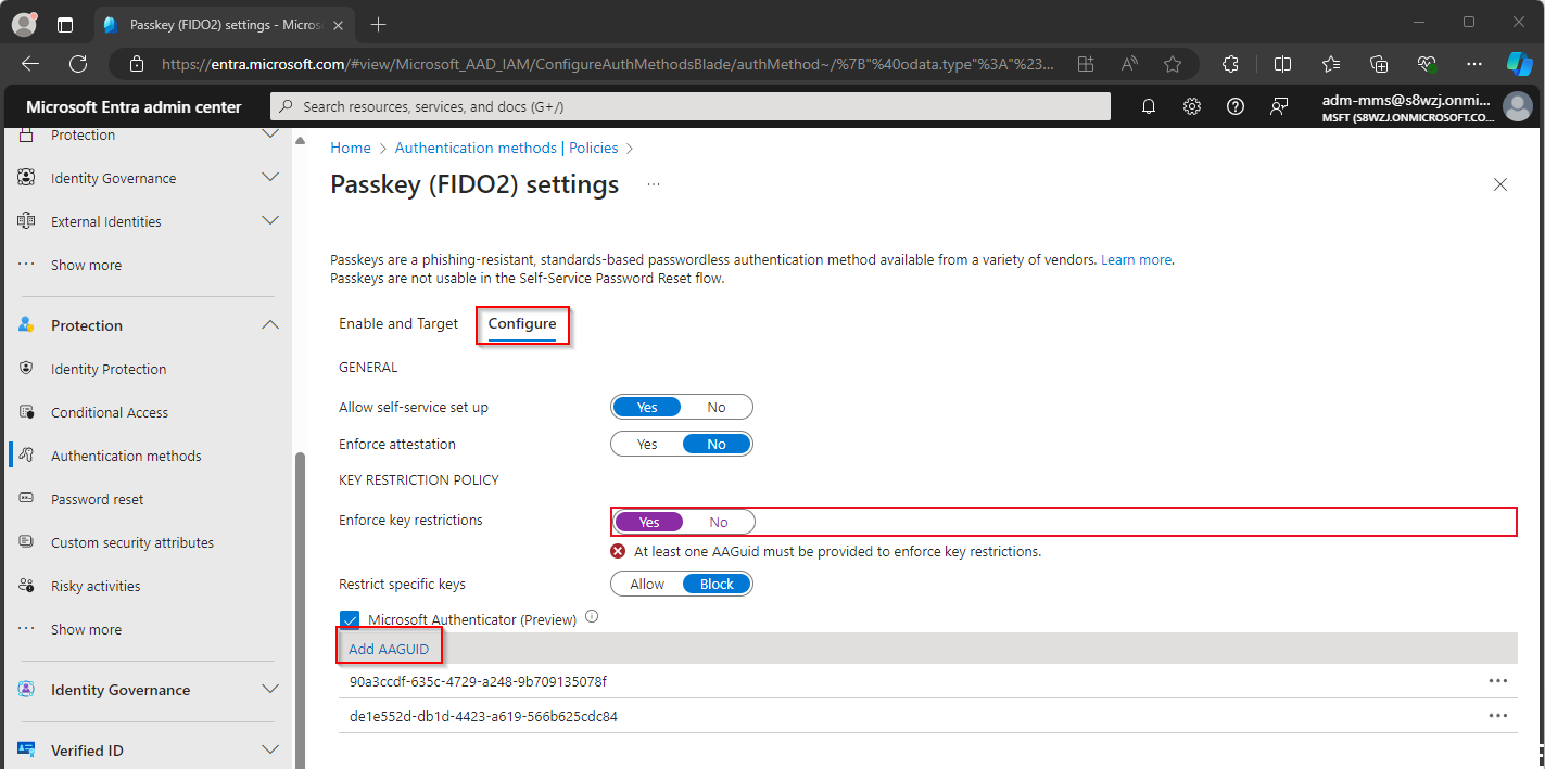 Now we can go to the Configure tab, as we here have an option to setup and set what types of Passkeys is valid to use and setup. This should be set to Yes if your organization wants to ensure that the FIDO2 security key model or passkey provider is authentic and sourced from a legitimate vendor