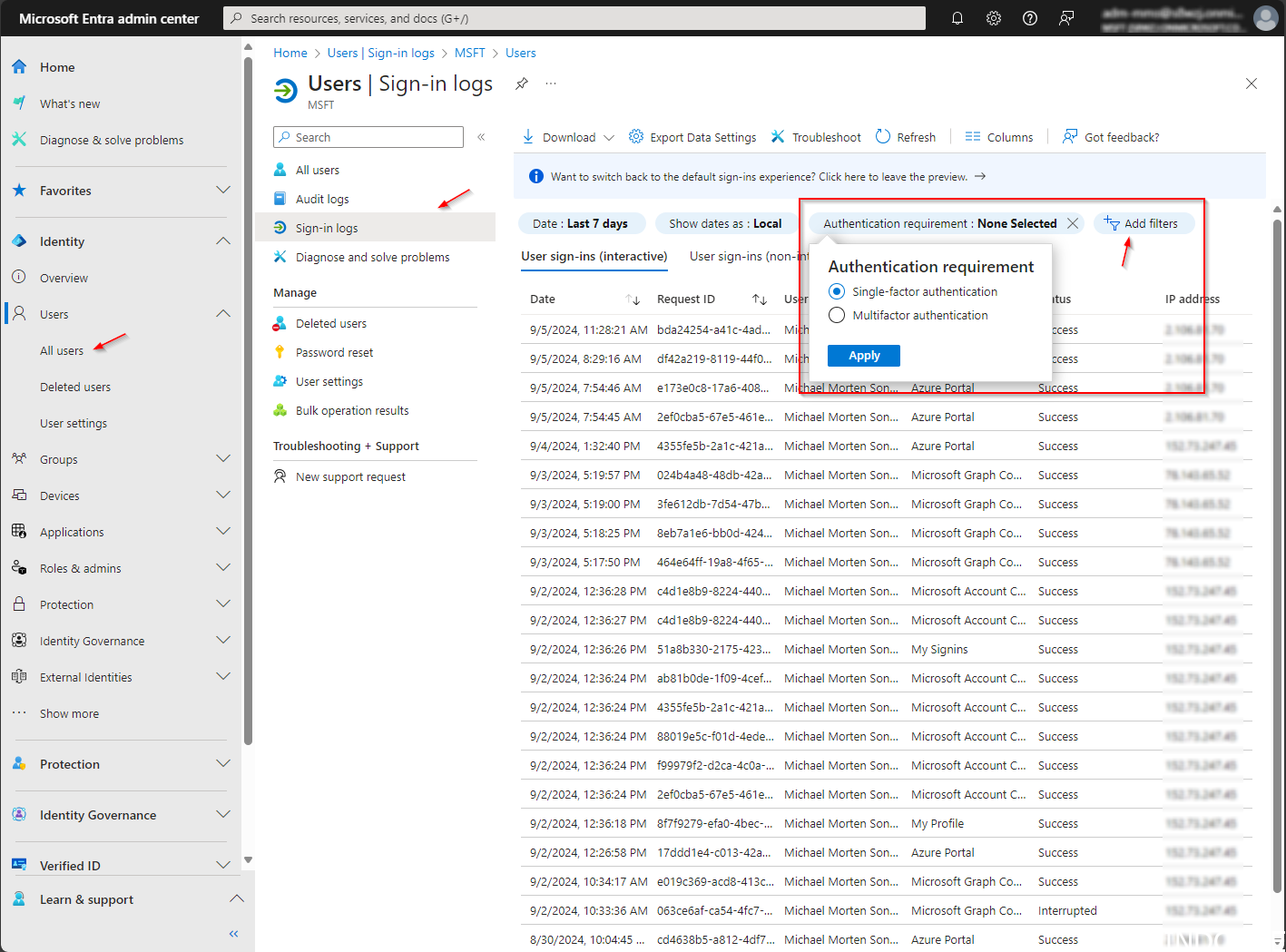 This policy won’t enforce changes but will start logging logins to Microsoft Admin Portals from the moment it’s created, helping you build a better list over time. Review failed logins to ensure MFA is enabled for those users. Note that it only logs new logins, not past ones.