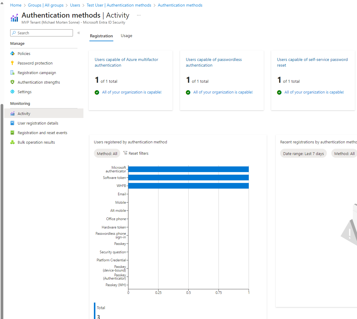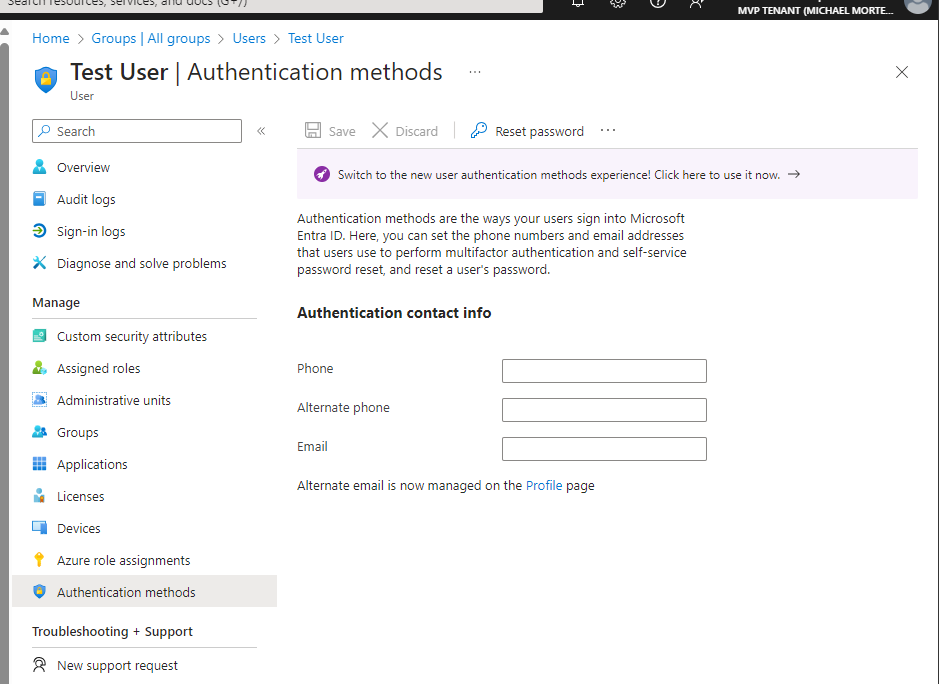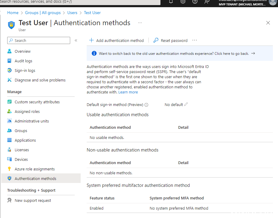 In the Entra ID portal, you can quickly check a user’s MFA capabilities by selecting the user account and clicking “Authentication methods” on the left. You may see a banner suggesting the “new user authentication method experience” (if you haven’t used it before). We highly recommend using it, as it offer a much better experience and support the new types of MFA (still not know why it´s there – but it is 😂)