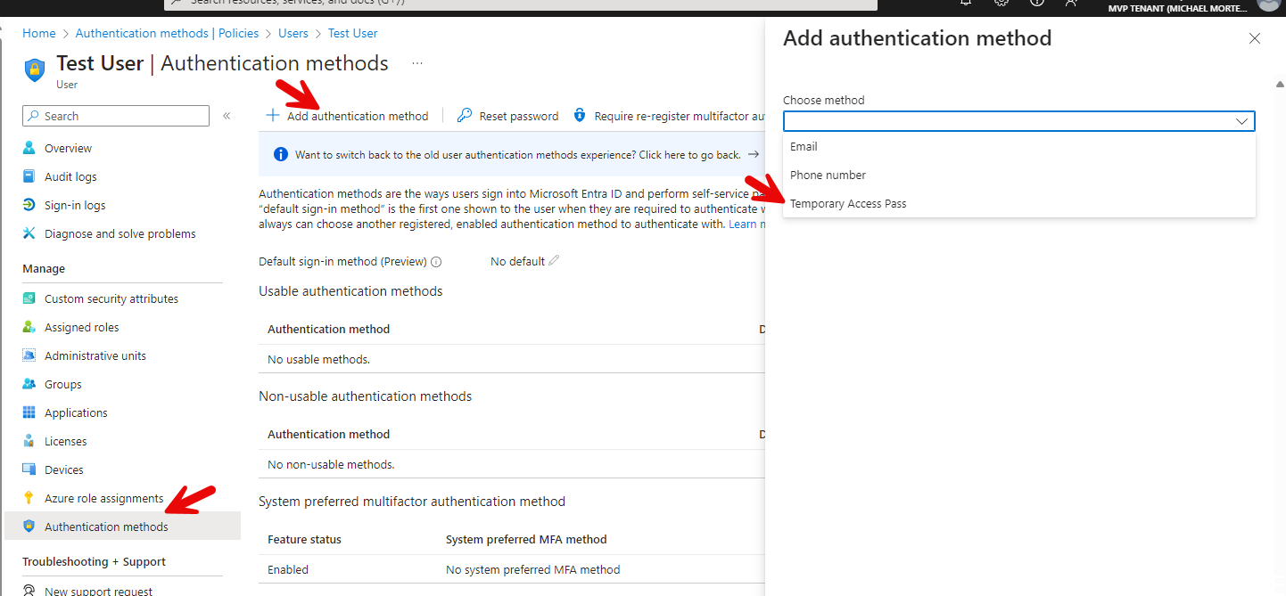 Now go to the user´s page for your break the glass account and select Authentication methods, then Add authentication method choose Temporary Access Pass and click Add on the following screen.