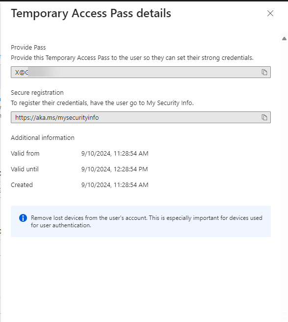 You’ll now see the Temporary Access Pass (TAP). Be sure to copy it, as it won’t be retrievable later. You’ll also receive a direct link for registering MFA. Note that this TAP is for one-time use only!