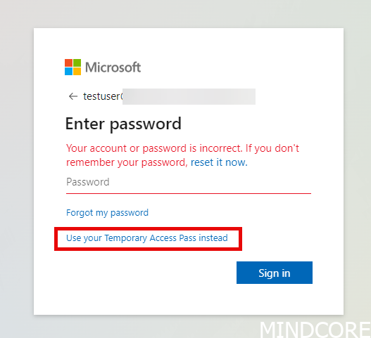 To register your key, we need to sign in to your break the glass account at https://mysignins.microsoft.com/security-info or via https://aka.ms/mysecurityinfo. Use the username like normal and then the TAP – please note that the TAP can´t be used like a normal password as shown here – you need to use the Use your Temporary Access Pass instead.