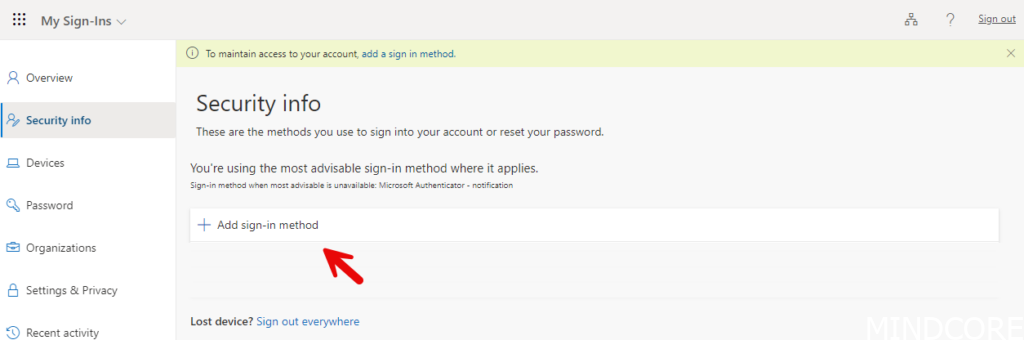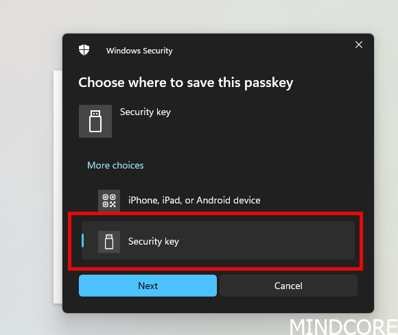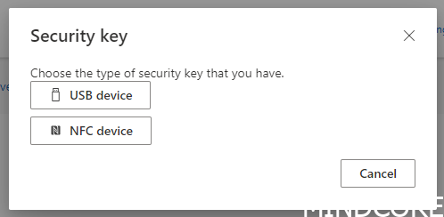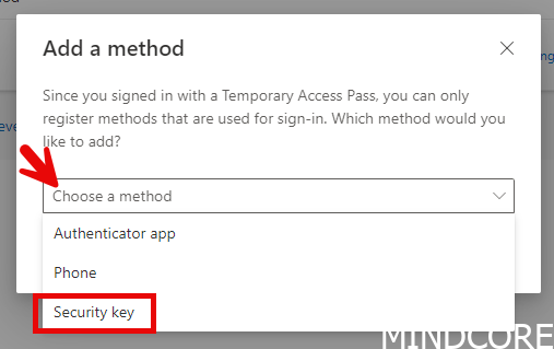 On this following page, select the option to “Add sign-in method” and then choose “Security key,” as shown here: