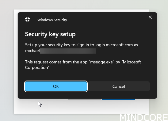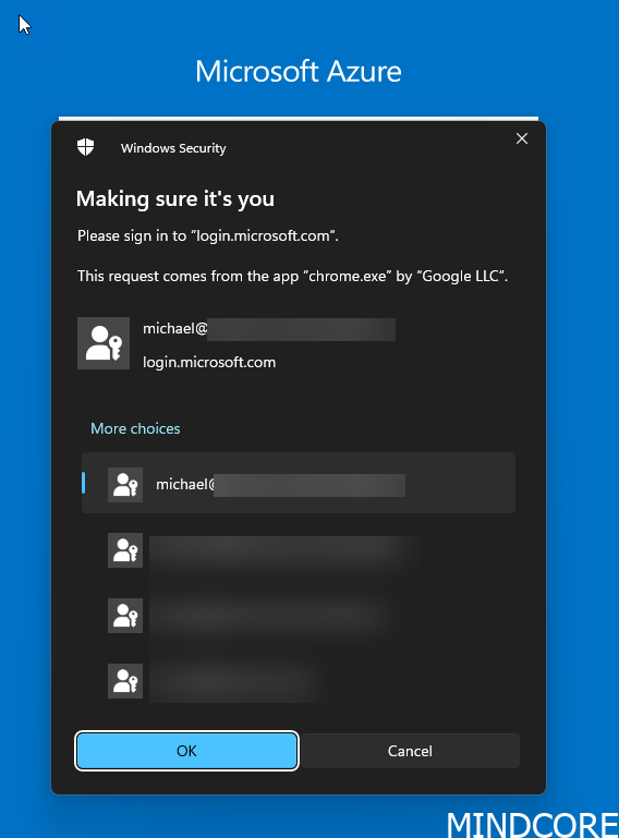 Now you see a list of accounts/users stored on your FIDO2 key is displayed here, and we can choose which one to sign in as and press “OK” in the bottom.