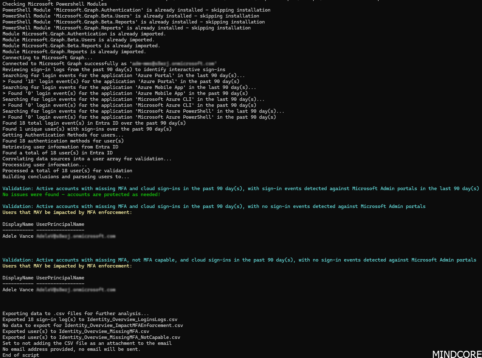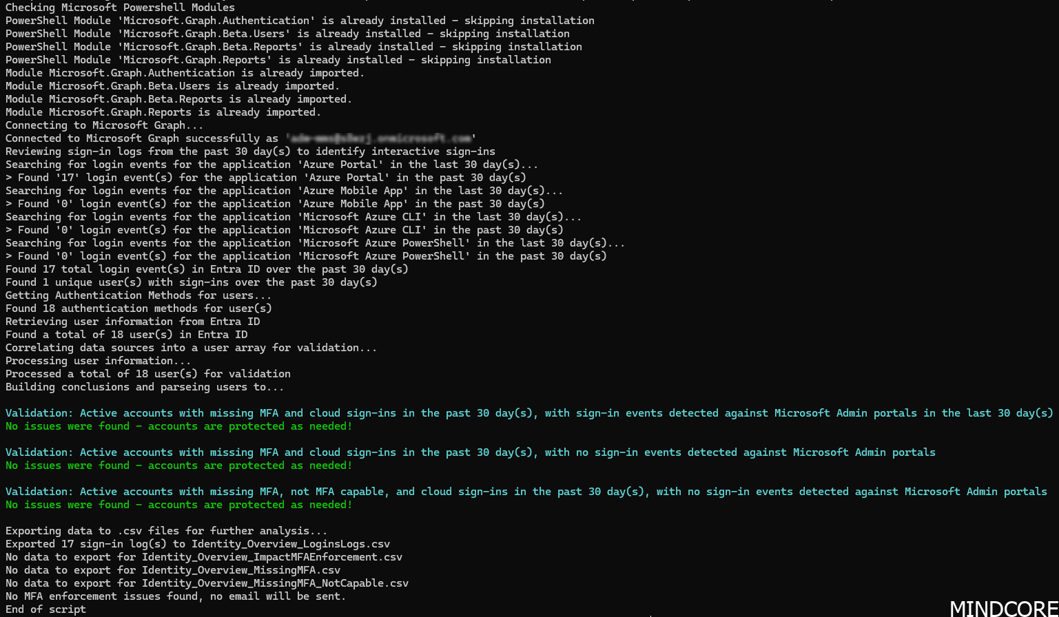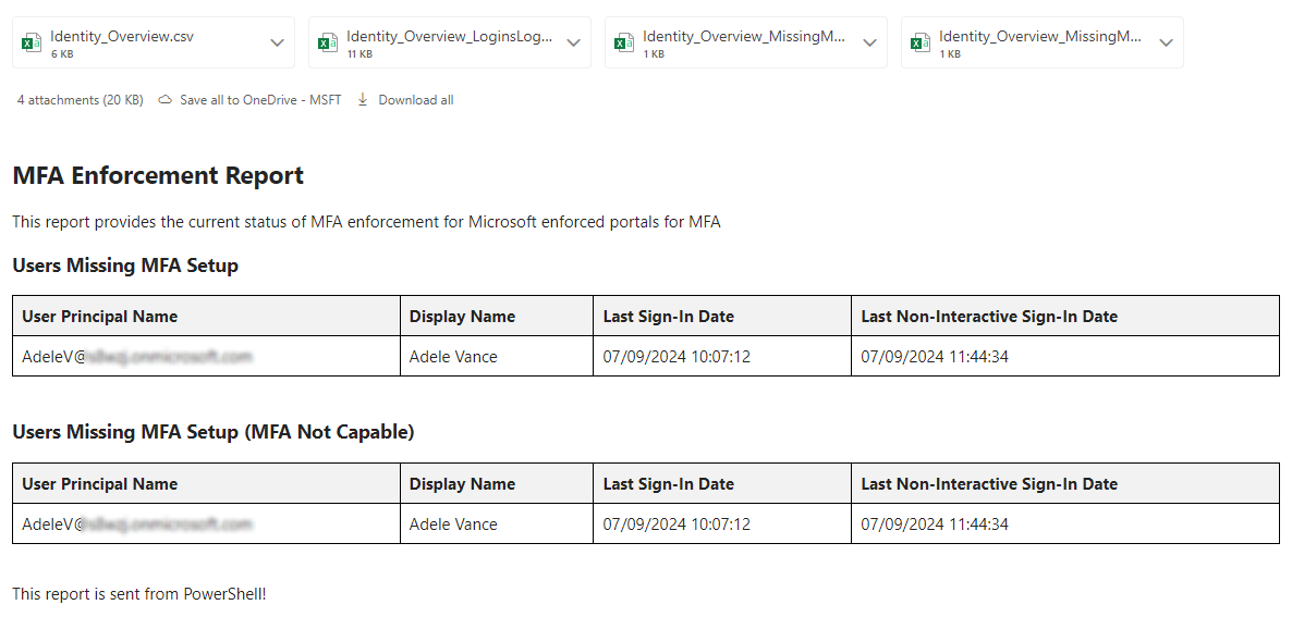 The email report there is send if any hits, provides the current status of Multi-Factor Authentication (MFA) enforcement across Microsoft enforced portals for your tenant (with an option to get the raw data in .csv files attached too! 😉).