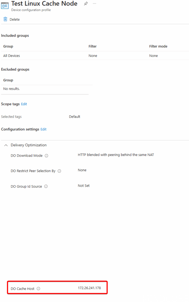 In order for the cache node to be used, Windows client devices need to be told where the node is located to request content. This is done by setting Delivery Optimization options and the easiest way to do this is through Intune.