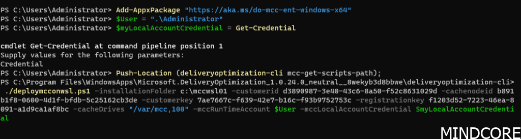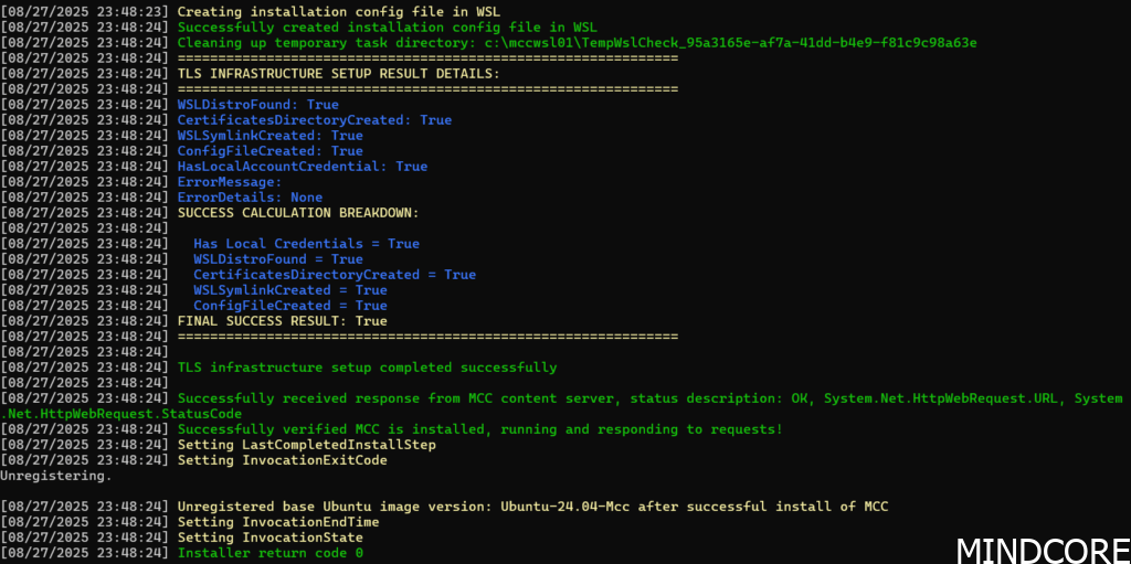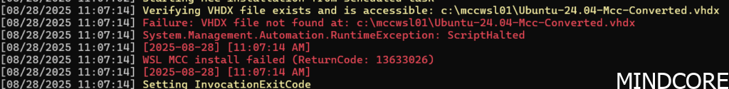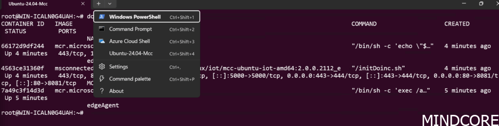 You’ll find an Ubuntu-24.04-Mcc-Converted VHD file in C:\mccswsl01 within which the WSL 2 instance is running. However, you won’t be able to access it from the deployment user. For that you’ll want to log in with the service account you’ve provided during deployment after which you’ll see the WSL instance within the terminal and you can access the docker containers: