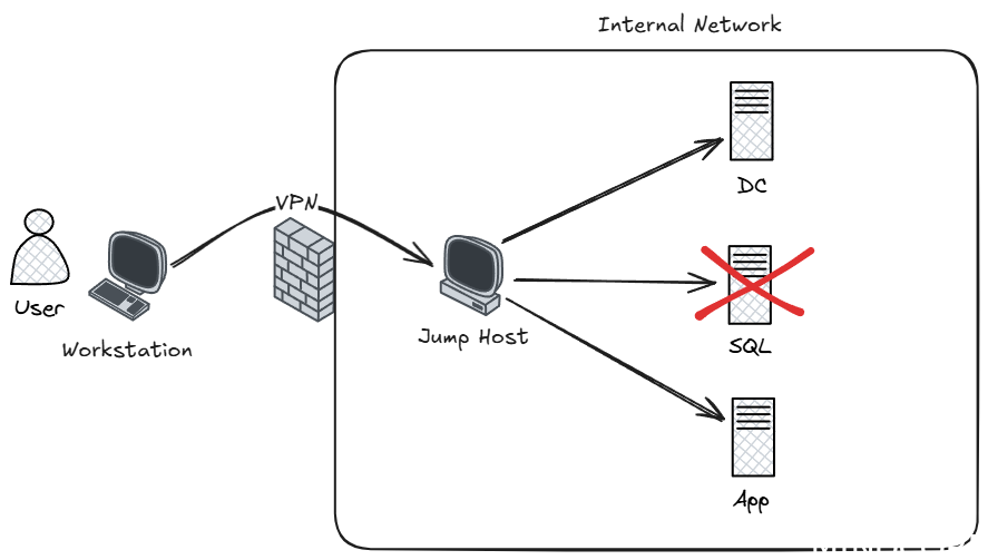 In the above example, once the user is on the jump host, there is often limited network separation implemented. The user may not have enough access to properly logon to the SQL server, but from a networking perspective, there is little stopping them from trying. If this user now obtains credentials that do have access to the SQL server, they’ll be able to login.