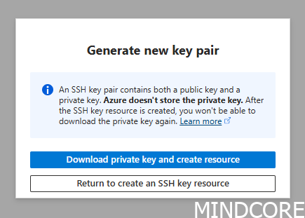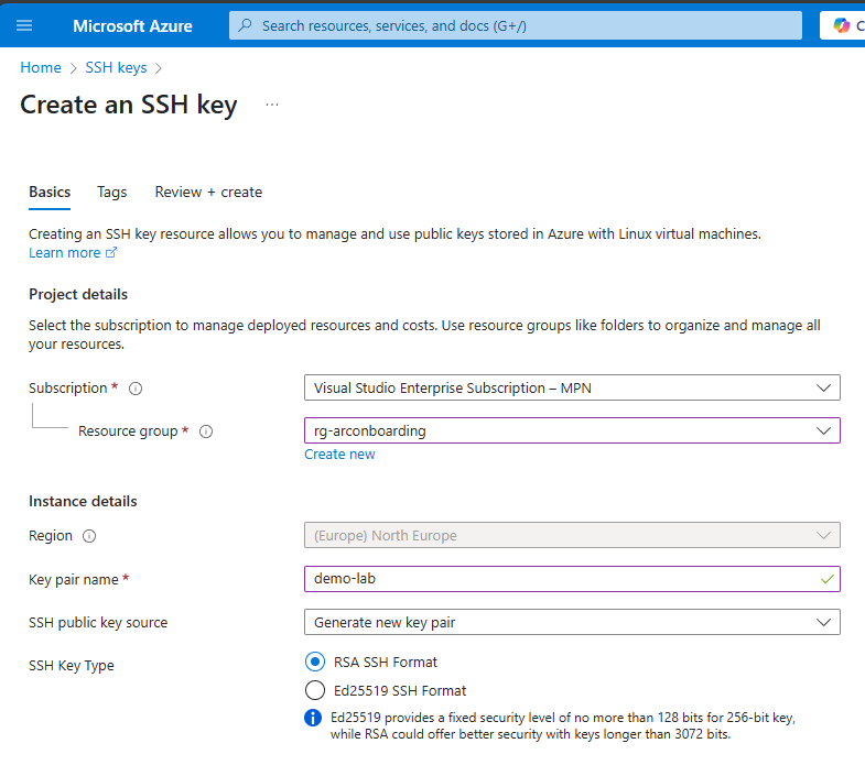 Generate an SSH key, this can be done either locally on the workstation or directly from the Azure portal: