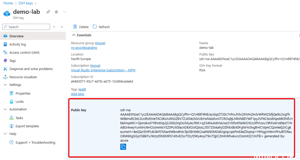 The value of the public key can be easily obtained by referencing the previously created SSH key in the Azure portal: