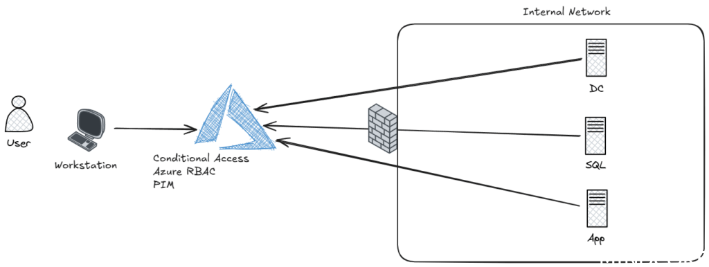 When a user needs to access a machine, no direct access to the internal network is required. Instead, the initial authentication is performed to Azure, where Entra ID’s Conditional Access Policies can be applied. This can ensure that prior to accessing, a compliant device is used. Furthermore, Azure RBAC ensures the user is only given access to exactly the resources they require, in exactly the same way it is done for normal Azure resources. This means that PIM can be used prior to the user being able to establish a connection to ensure MFA has been performed, or a justification reason is given to access for example, Tier 0 resources.