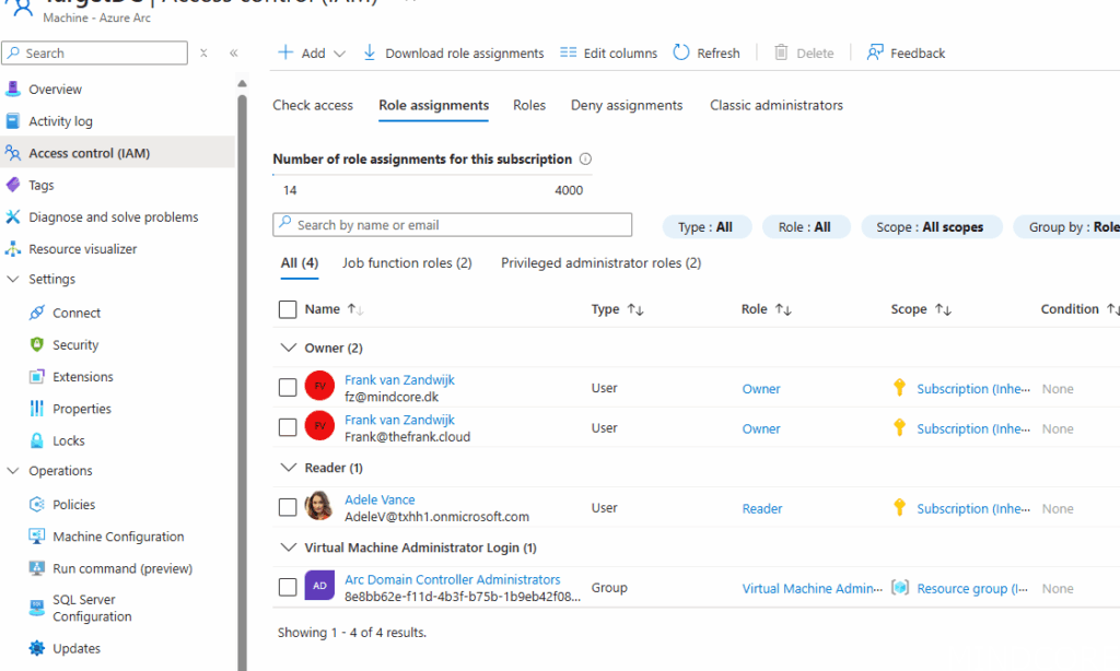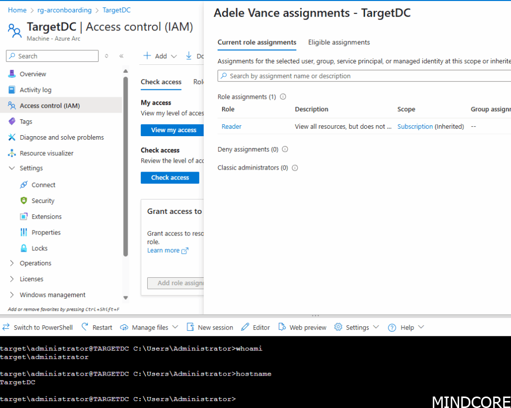 The above Azure Arc machine has been configured to allow ‘Adele’ to see the machine but should not be able to access it unless she’s also added to the ‘Arc Domain Controller Administrators’ group. That group has specific PIM requirements.