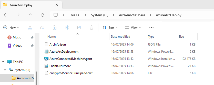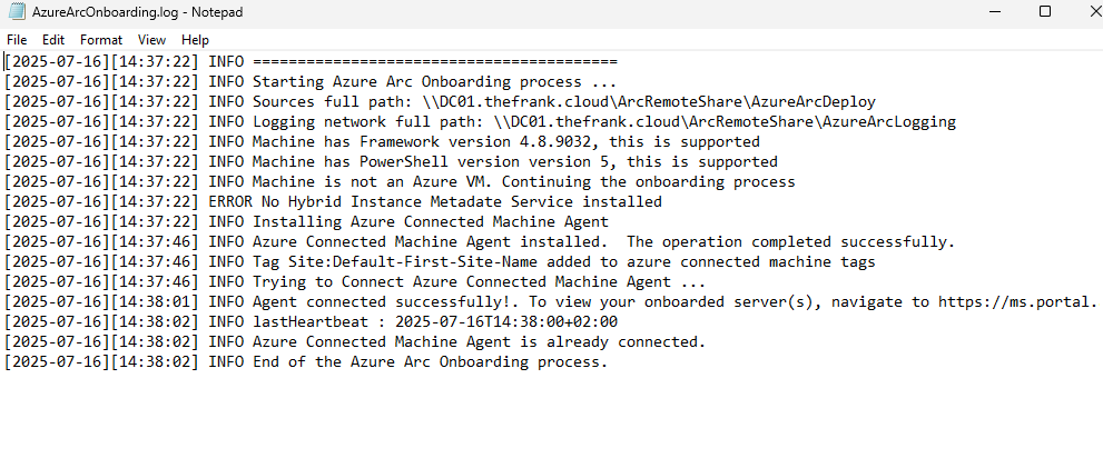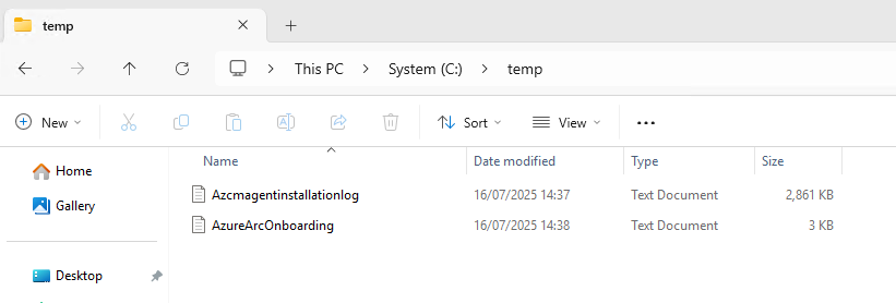 For a successful Arc onboarding, no logs will be pushed to the shared folder ‘AzureArcLogging’ but there will be some local logs left on the machine in $env:SystemDrive\temp: