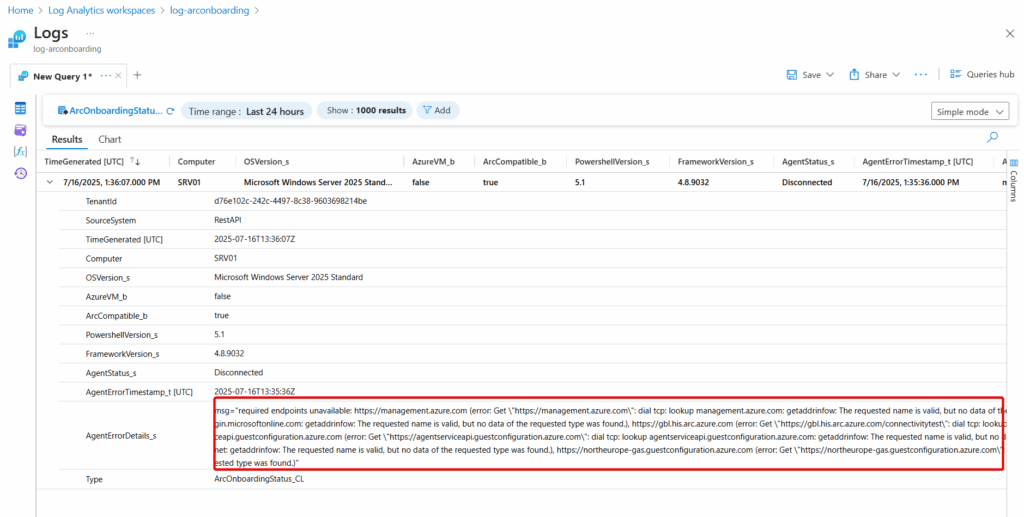 If log files are detected, it will upload them to a Log Analytics workspace, this includes the last error message for easier troubleshooting: