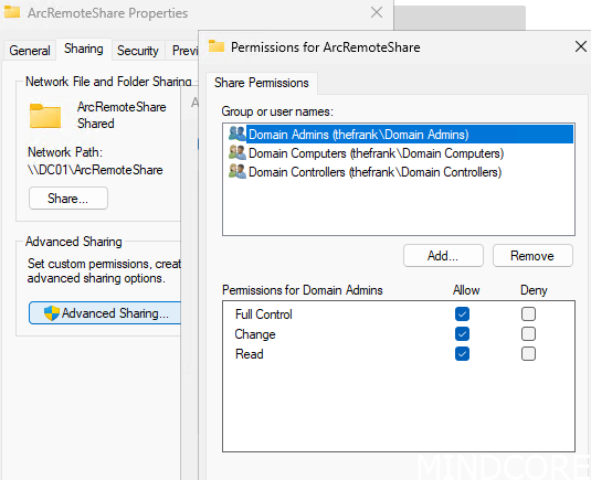 On my Lab Domain Controller, I’ve created a remote share that will host the agent package alongside the configuration file it needs. It’s configured to provide Domain Controllers, and Domain Computers with Change permissions, and Domain Admins with Full Control permissions: