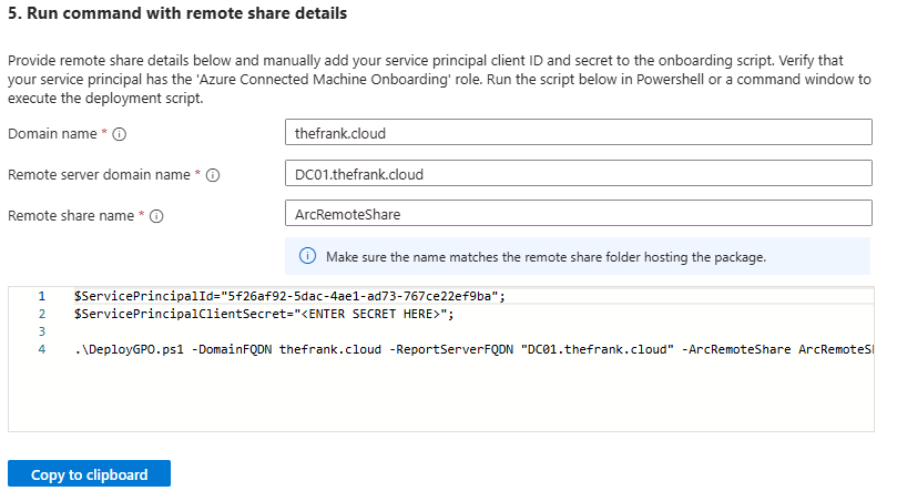 Next, download the required scripts and verify them. These are also not required to be run from a DC (and that’s definitely not recommended). Microsoft helpfully provides some fields to fill in back on the onboarding page that generates the required script for you: