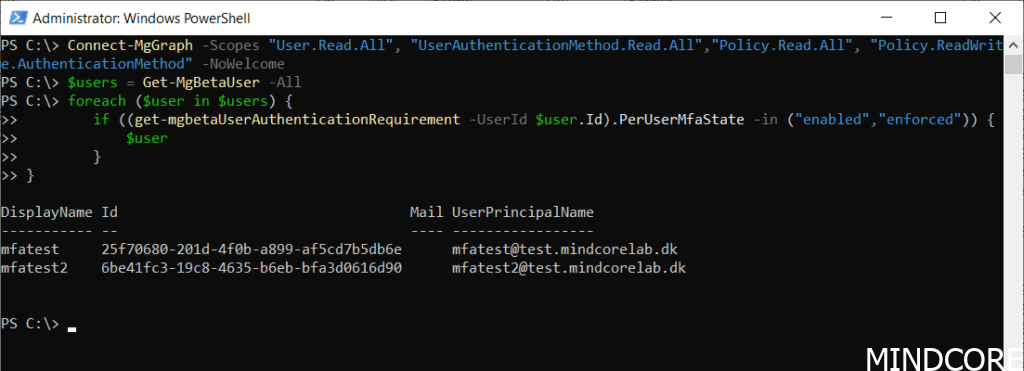 if ((get-mgbetaUserAuthenticationRequirement -UserId $user.Id).PerUserMfaState -in ("enabled","enforced")) {