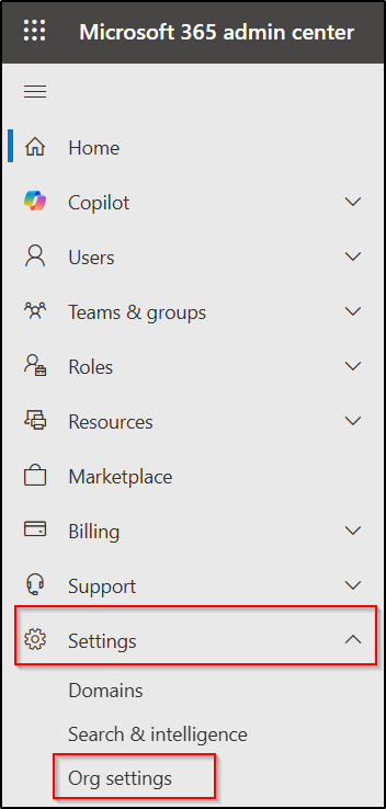 Let start in the admin portal https://admin.microsoft.com/ and go to Settings – Org Settings.