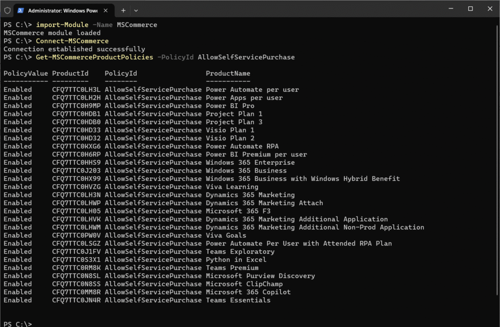 Get-MSCommerceProductPolicies -PolicyId AllowSelfServicePurchase
