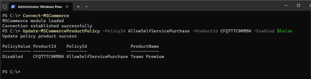 Update-MSCommerceProductPolicy -PolicyId AllowSelfServicePurchase -ProductId CFQ7TTC0RM8K -Enabled $False