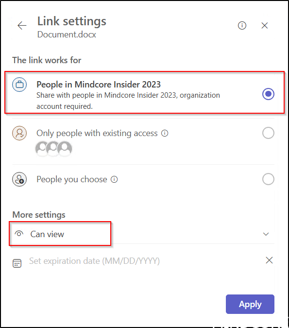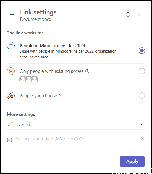 Again since we are sharing from a Team site, default is set to Only people in your organization, and permission is set to Edit.