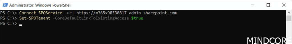 PS C:\> Set-SPOTenant -CoreDefaultLinkToExistingAccess $true