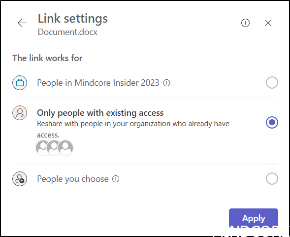 We recommend selecting the option, Only people with existing access. However, this choice is not available as a default setting in the SharePoint Admin portal. Our recommendation is based on the fact that this option does not alter the existing permissions on the object.