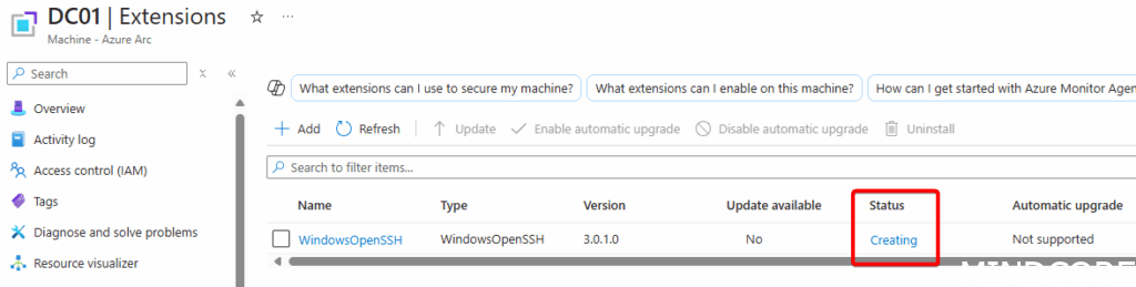 Under extensions, the WindowsOpenSSH status shows it is being installed (this can take a few minutes; hence a durable function is best to use here):