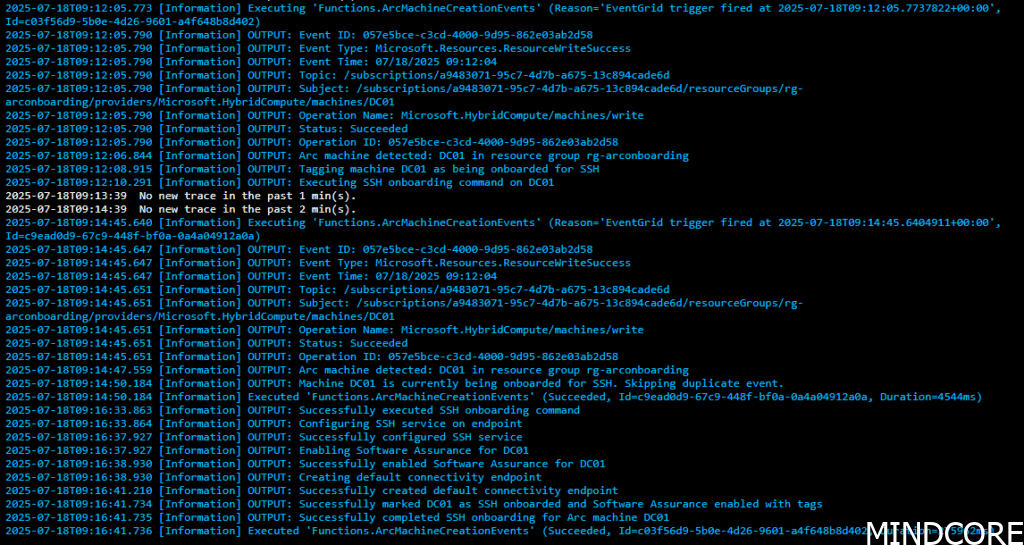 Within seconds of the machine being created within Azure, Event Grid has sent a notification to the Function App which parses the result, identifies the new machine, tags it, and begins installing the SSH extension: