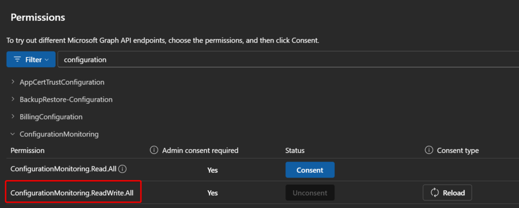 Next we can flip back to Graph Explorer to kick things off, be sure to grant yourself ConfigurationMonitoring.ReadWrite.All permissions so you can actually start: