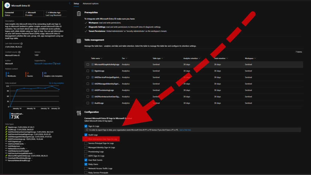 Turn on only the connectors and data types required for detections. High‑volume sources such as network flow logs and Microsoft Entra ID “Non‑interactive sign‑in” events can saturate ingestion without improving coverage. These events are emitted by automatic authentications, for example, when opening a Microsoft portal tab.