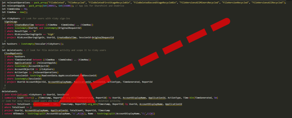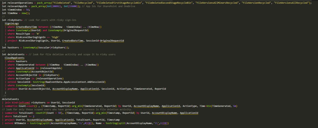 The template’s KQL includes logic like “TotalCount = countif(Count > 50),” which counts how many 5‑minute buckets exceed 50 deletion events per user/app (from a prior summarize). Increasing this threshold (e.g., to 100) reduces false positives by requiring a higher activity level before alerting.