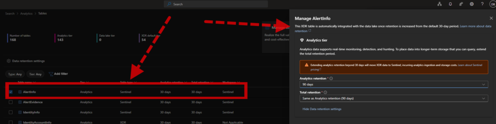 The Tables view allows sorting by XDR vs non‑XDR, but labeling can be unreliable because many tables blend XDR sources. To verify, open the table details and check for the “This XDR table” indicator; keep those at 30 days. Non‑XDR tables can be set to 90 days to optimize cost without losing necessary history.