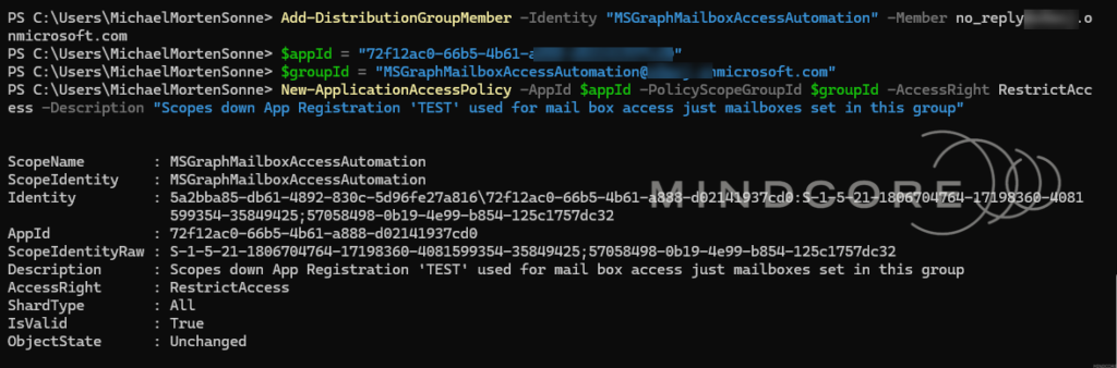 New-ApplicationAccessPolicy -AppId $appId -PolicyScopeGroupId $groupId -AccessRight RestrictAccess -Description "Scopes down App Registration 'TEST' used for mail box access just mailboxes set in this group"
