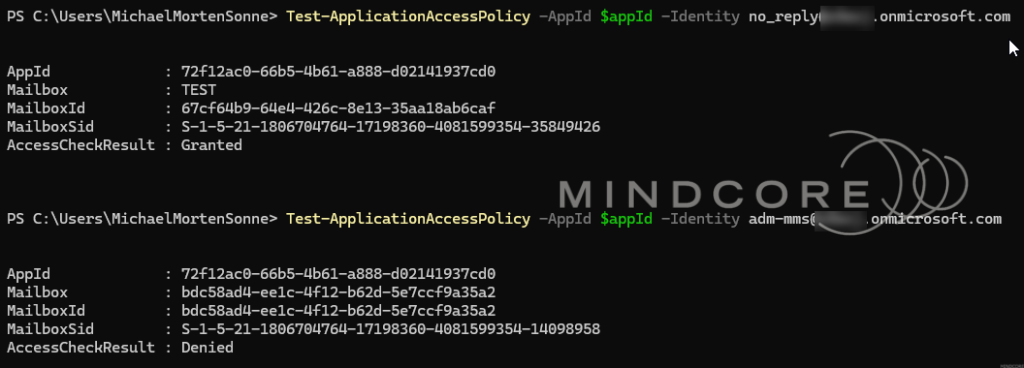 Now let´s us test the policy. Here we use the application ID from Entra ID earlier and try accessing a mailbox that the application should have access to, as well as one it should not. The results will show whether the policy is being enforced correctly.